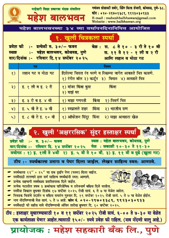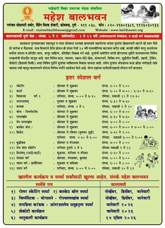 further details contact to Mahesh Balbhavan between 5 and 7.30 pm only